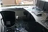 Kontoret til sjefredaktør Arne Strand var nokså ødelagt. Men tv´en i hjørnet sto fremdeles og gikkFoto: Eirik Hoff Lysholm.