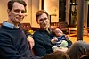 Fra venstre: Medieforsker Tellef Solbakk Raabe leder KI-arbeidet i tenketanken Langsikt som ble startet av Aksel Braanen Sterri - her med lille Niko på fanget.Foto: Tormod Haugstad