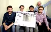 Dobbeltsiden fra Klassekampen henger på veggen hos Minerva. Fra venstre: Nils August Andresen, Mads Motrøen, Lars Akerhaug, Pål Mykkeltveit og Helge Øgrim (bak). Og ja: Det jobber kvinner her, men de hadde alle tatt ferie da Medier24 var på besøk. Arkivfoto.Gard L. Michalsen