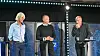 NRKs sportsredaktør Egil Sundvor (t.v), TV 2s sportsredaktør Vegard Jansen Hagen og Amedia-direktør Helge Birkelund på scenen under Sportskonferansen 2021 i Media City Bergen.Foto: Even Hye T. Barka