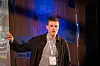 Øystein Silde Frønsdal, sjefredaktør i Avisa Hordaland, forteller fra scenen om hvordan de har jobbet for å nå de unge. Avisen er i Amedia, og er dermed omfattet konsernets ung-prosjekt.