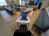Han sender over et bilde fra en av de større salene, der han dekket en sak. Her er det faktisk pressebenker, men uten strømtilførsel. Dermed fant han seg i stedet til rette i hjørnet.