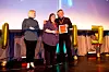 Astrid Valen-Utvik får prisen under Social Media Days tirsdag denne uka. Til venstre konferansier Susanne Egset, til høyre konferanseleder og reklamenestor Nils-Petter Nordskar.SMD