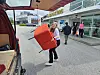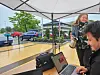 teamet også tatt med godstoler, som de plasserer utenfor teltet. Der har de et