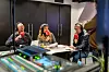 Medier24 møter programlederne Geir Schau, Øyvind Loven og Kim Dahl mens de holder sending fra kantina, med kollegaer som publikum.