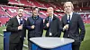 Fotballkommentator Roar Stokke (nummer to fra venstre) på Old Trafford i Manchester, sammen med Viasport-kollegene Daniel Høglund, Lars Tjærnås og Jan Åge-Fjørtoft.Terje Pedersen