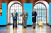 Fra venstre: Rektor ved UiB, Margareth Hagen, prisvinner Leif Ove Larsen og prorektor ved UiB, Pinar Heggernes.