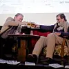 Hans-Wilhelm Steinfeld og avdød UiB-professor Frank Aarebrot i diskusjon om internasjonal politikk i Sogndal, i januar 2017.Privat
