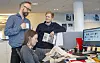 Redaksjonssjef Frode Frøyland, designer Jørgen Brynhildsvoll og vaktsjef Gøril Sæther leser i et rykende fersk prøvetrykk av den nye lørdagsutgaven til DN.Eira Lie Jor