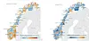 BEFOLKNINGSNEDGANG: Kartet til venstre viser en fremskrevet befolkningsutvikling i norske kommuner frem mot 2050. Kartet til høyre viser at kombinasjonen av innenlands flytting og lavere fødselsrater vil føre til at det vil bli færre mennesker i aldersgruppa 18-49 år i de fleste norske kommuner i 2050, men at dette særlig rammer distriktskommuner hardt.Kart fra SSB