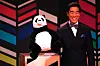 Programleder Fredrik Solvang med pandaen under partilederdebatten på NRK fredag kveld.