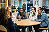 På Lambertseter videregående skole i Oslo er det storefri. I kantina er det fullt av elever som spiser lunsj. Ved et bord sitter seks gutter å spiser og snakker sammen.