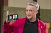 Berit Reiss-Andersen, leder av Nobelkomiteen, viser frem et bilde på en mobiltelefon av årets fredsprisvinnere, journalistene Maria Ressa og Dmitrij Muratov.