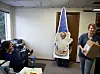 MEDIENISSE: The Norwegian American sin maskot er sjølvsagt ein fjøsnisse. Frå venstre: ofice assistant Deborah Stoner-Ma, office manager John Erik Stacy og redaktør Emily C. Skaftun. NAW står for Norwegian American Weekly, men no kjem avisa kun ut annakvar veke.Ingerid Jordal