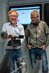 Kai Aage Pedersen (T.V.) og Bernt Ove Berntsen (T.H.) gjer kamerautstyret klart til videoproduksjon.