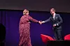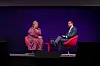 Statsminister Erna Solberg (H) intervjues av Svein Tore Bergestuen på «Late Night Show» under SKUP-konferansen fredag.