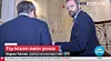 På vei opp trappene til møterommet hvor Siv Jensen avholdt pressekonferansen ble Takvam intervjuet på direkten av NRK-journalist Knut Magnus Berge.