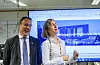 Rektor Johann Roppen og høyere utdanningsminister Iselin Nybø feirer nytt mediebygg ved Høgskulen i Volda.Eira Lie Jor