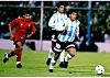 Diego Maradona jakter ballen under en vennskapskamp mot Marokko i 1994.REUTER