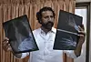 Journalist Kadafi Zaman ser på sine røntgenbilder på et sykehus i Pakistan.