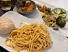 En ganske god carbonara og en omlett, visstnok med majones hos SchibstedFoto: Torill Henriksen