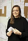 På en korktavle henger kort med handling, med fargekode for hver av de tre jentene. Elise er blå, Nenne er rød og Alex grønn.