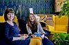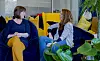 Med blå kjole og okergule strømpebukser matcher samfunnsredaktøren interiøret i den nye loungen på en god måte.